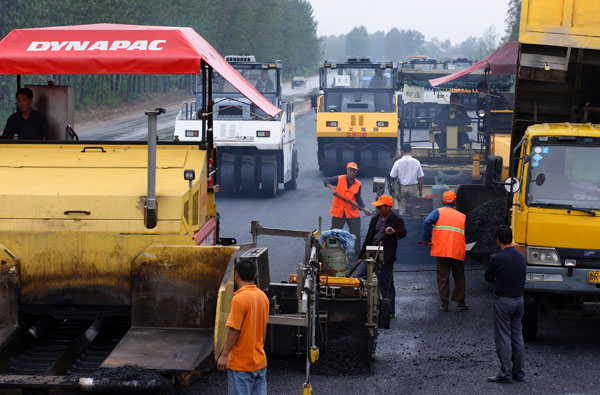 一片繁忙的沥青摊铺现场
