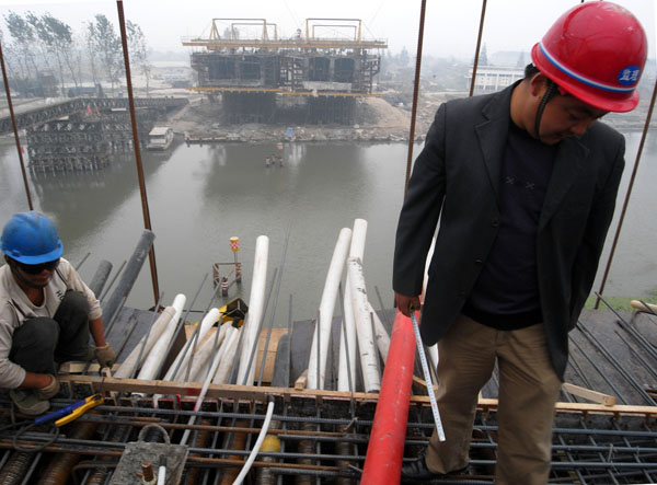 现场旁站监理在通榆河大桥主跨悬浇箱梁施工现场实时检查钢筋制作质量。