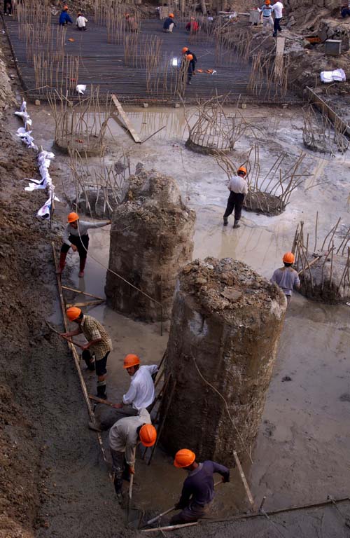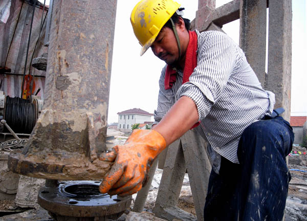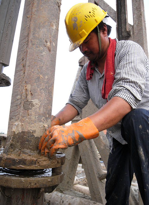 通榆河大桥工地,湿喷桩施工工人正在加接浆筒之二