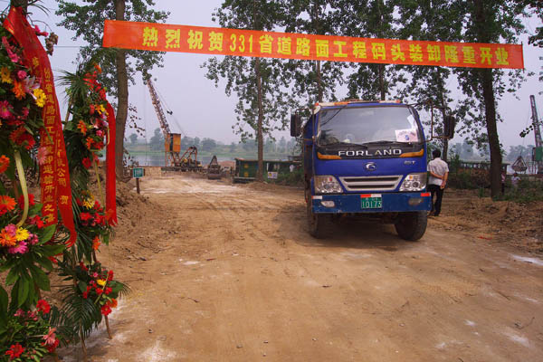 6月16日上午,第一辆装满砂石的运料车驶出S331盐城东段工程路面二标装卸码头,据安排,全段水泥稳定土层试验段将在18日开铺。 当前距工程的全面开工时间不过3个月,但在交通部门的精心组织安排下,全线各标自始至终紧锣密鼓,整个工程推进进度迅速。至6月16日,路基施工已完成大半,土方开挖、原地面处理、沟塘回填均接近尾声,94区5%灰土回填完成工程量255096平方,占总工程量的36.92%,96区6%灰土回填完成工程量415271平方,占总工程量的53.45%;钻孔灌注桩完成工程量245根,占总工程量的69%;圆管涵完成工程量32座,占总工程量的84%;湿喷桩完成工程量86120米,占总工程量的81%;梁板完成工程量916片,占总工程量的69%。通榆河大桥10#主墩承台也于近日封底结束,承台将在2009年6月底结束,11#墩承台将在7月中旬浇筑结束。全线累计已完成投资达到11851万元。