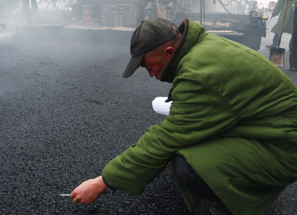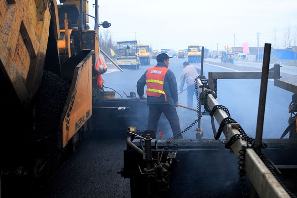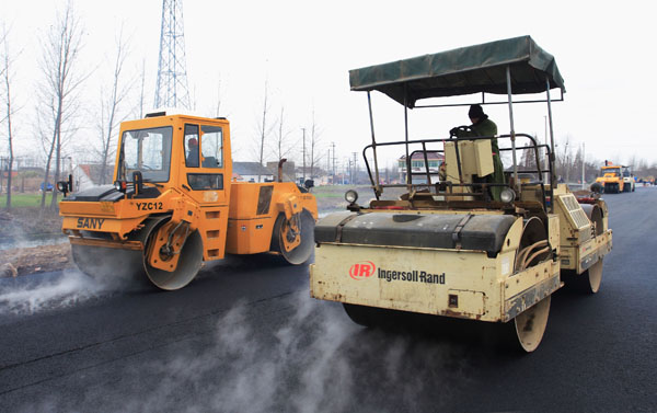 压路机按冬季施工要求快速跟进,摊铺后随即进行预压复压。