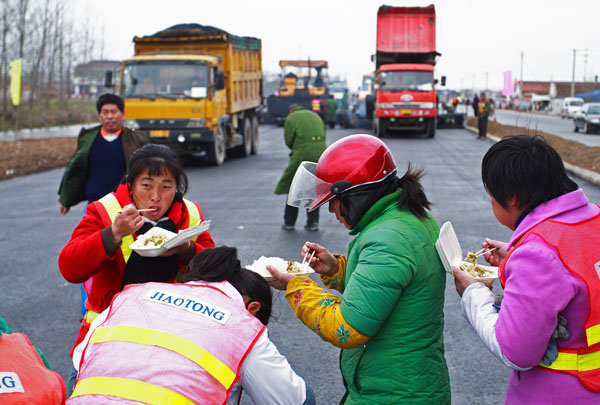 风中之餐——为了早日建成S331,服务沿海大开发,工程建设者们分秒必争,午饭都是在施工点上轮换着吃。28日天气阴冷,寒风嗖嗖,虽然饭盒里的饭菜一会儿就凉,建设者们的心却热乎乎的。
