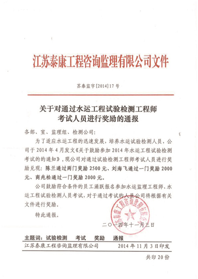 关于对通过水运工程试验检测工程师考试人员进行奖励的通报